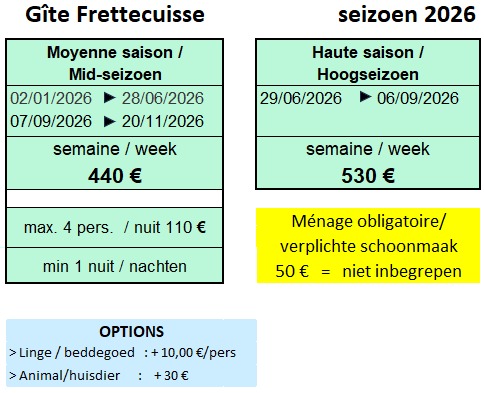 Buiten die maanden ook mogelijk te boeken als Chambre d’Hôte, vanaf 2 nachten.