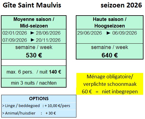 Un acompte de 40 % est demandé pour toute confirmation de réservation, le solde à l’arrivée.